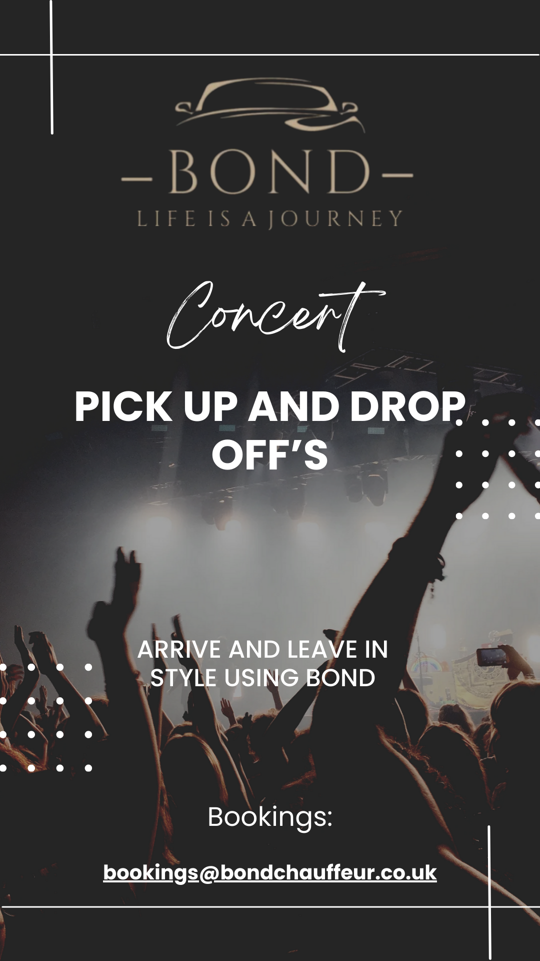 We are here to cater for your every need. Whether you're looking for a london shopping trip, airport transfer or pick up, concert travel in style and much more. Contact Bond and arrange your perfect day.
